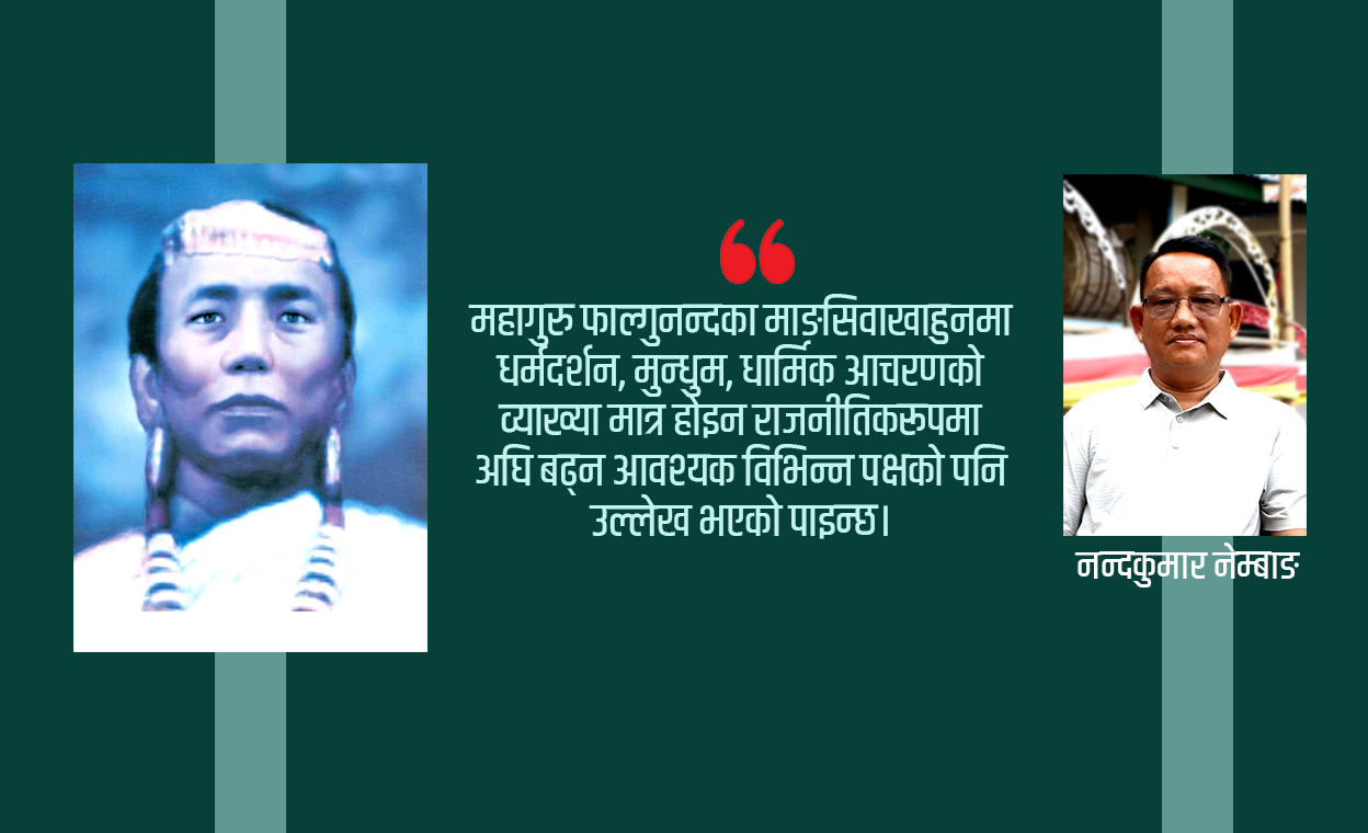-नन्दकुमार नेम्बाङ महागुरु फाल्गुनन्दका माङसिवाखाहुनमा धर्मदर्शन, मुन्धुम, धार्मिक आचरणको व्याख्या मात्र होइन राजनीतिकरूपमा अघि बढ्न आवश्यक विभिन्न पक्षको पनि उल्लेख भएको पाइन्छ। विषय प्रवेश महागुरु फाल्गुनन्द लिङ्देनले पल्टनबाट फर्किनुभएपछि तत्कालीन लिम्बुवानको विभिन्न थुमहरू घुम्दै बिताउनुभयो। यही क्रममा उहाँले समाजलाई अनुशासित, मर्यादित र आचरणशील बनाउनुपर्छ भनी माङसिवाखाहुन (दिव्योपदेश) दिनुभयो। ती दिव्योपदेश तागेरा निङवाभूमाङबाट प्राप्त भएको र…